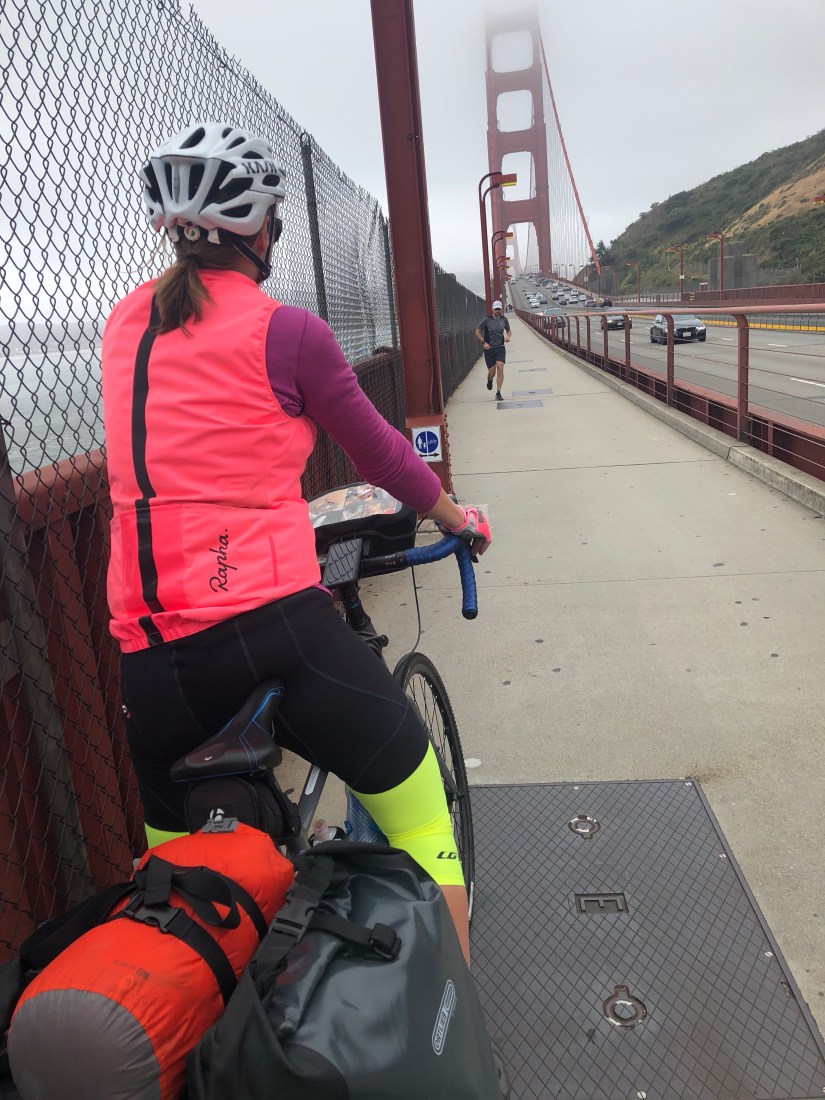 I’m certain that this is why the only time I cried during our tour was pedaling across that bridge. It was cold. Gray. The pedestrian-path was thickly crowded with tourists either oblivious or clumsy or both. The headwind was considerable. The traffic, high-volume and thunderous. These were not ideal riding conditions. And yet: I’m not sure that I’ve ever been more euphoric on a bike. It’s not like I hadn’t seen the bridge again since that wretched MLA meeting. I’d gotten a job in the west. I’d bar-hopped in The City, gone to ball games, enjoyed the kind of food that the girl I was before couldn’t even have imagined. I’d walked on the bridge. I knew what color it was, knew the scale. But this was different. This was on the bucket list I’d finally—presumptuously? defiantly?—created even before my life started taking shape.