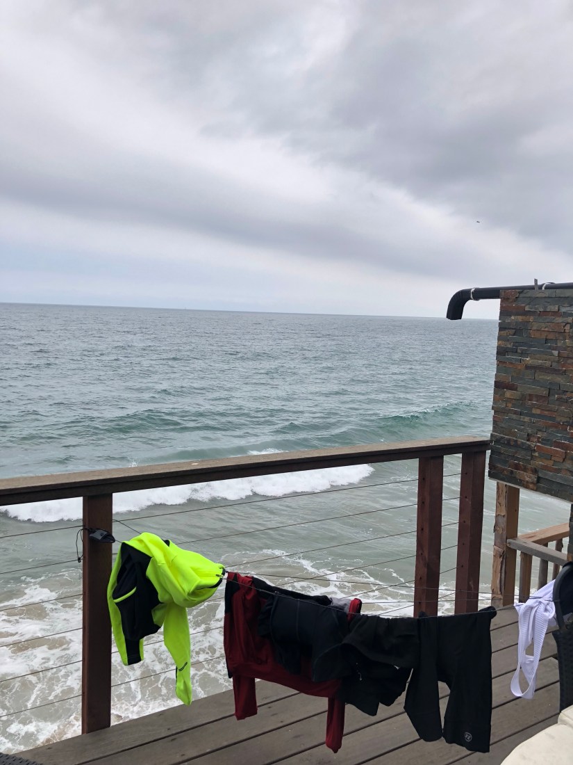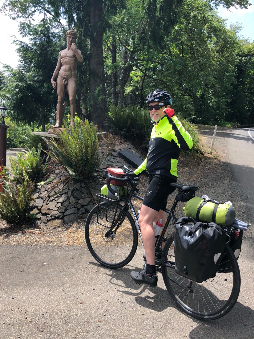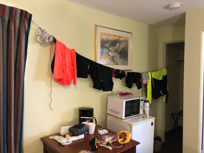 Some friends have asked what we took with us. Lightweight camping gear: itty-bitty tent, sleeping bags, pads, a stove, itty-bitty chamois towels, matches, itty-bitty bottles of dish and body soap, a lightweight solar lantern, two titanium cups and bowls, two sporks, one fuel canister, two freeze-dried meals just in case, and a bottle opener. A first-aid kit (which we barely touched). My clothes list: two pairs of underwear; two sports bras; two pairs of riding shorts; two riding shirts; a wool racerback tank that I wore under my jersey almost every day and which, wool or no wool, got powerful smelly; a quick-dry t-shirt; a pair of gym shorts; a pair of long, stretchy, gray wool pants for evenings; a long-sleeved wool half-zip which I wore most mornings; two pairs of socks; flip flops; bike shoes; a beanie; a ball cap; a hot-pink riding vest; a rain jacket; rain pants; leg warmers; arm warmers; mittens and toe-socks for camping; and short- and long-fingered bike gloves. In Astoria, freezing, I bought a hoodie. I should’ve taken a lightweight warmer jacket (luckily our friend, Tom, loaned me an old one of his in Santa Cruz, so the last stage was the warmest stage). We also brought an iPad, Ziploc baggies (useful for icing the knees), Phase-10 (our camping card game of choice), a bag of chargers, headlamps, bike tools, some power bars, an itty-bitty pack of detergent for doing laundry in hotel tubs and sinks, a travel clothesline, eco-friendly wet wipes, and a whole lot of sunblock, which David used by the gallon and I applied strategically to my ears and nose.
