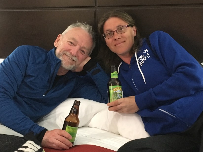 The biggest thanks come last: I would never have been able to ride this ride if it weren’t for David, the most up-for-anything and ready-for-anything and capable-of-anything touring companion and life partner a girl could ask for. I’m not always easy: I want a lot out of every day. He tolerates my ridiculous demands for more, and more, and more, my relentless insistence on optimizing every experience, but he’s wise and kind and attentive, and helps me see when I’m pushing too hard. When I say I couldn’t have done it without him, I don’t just mean because he’s the guy who pumps up the tires and lubes the chain, or because he’s my navigator and almost always finds our way. He’s also the one who makes me laugh at myself when I’m a little too uptight, and when in these troubled times what I see is darkness, and that darkness makes it hard to function, he’s the one who shines the light. He keeps me warm. What sunblock I use is because of him. He’s my favorite person, my constant companion, and if I couldn’t toast with him at the end of a 70-miler there would be no point to the ride or the pint.