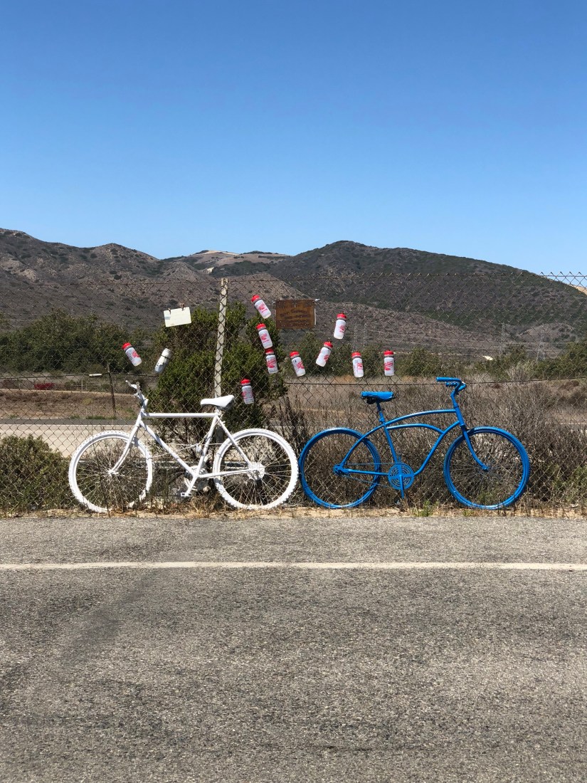 Memorial for two bicyclists, who died on this road (near San Onofre) a few years apart. The water bottles are inked with solemn messages; we stopped to pay our respects.