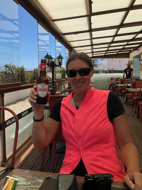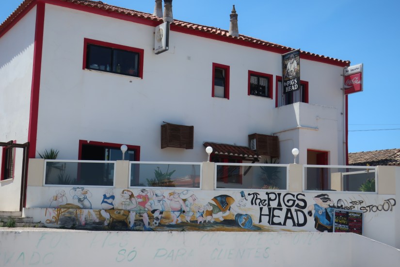 Two-thousand-year-old Sagres, once the haunt of Phoenicians, Carthaginians, Romans, and Moors, today feels sleepy, its almost uniformly whitewashed walls and red-tile roofs clustered around a modest and, for a Saturday late afternoon in later spring, unbelievably quiet downtown. “Downtown” here consists of alternating surf shops and tiny cafes. Today’s the first day in Portugal where it feels hot enough for ice cream; all we could find were chocolate/vanilla popsicles, not inspiring but certainly refreshing. Ashley made friends with a few stray cats as we walked the residential streets in search of a cervejaria which turned out to be closed, as in permanently shuttered. Back to town through the winding lanes of homes and gardens, to a passable sports bar for a couple of cold Imperial pints of Sagres.