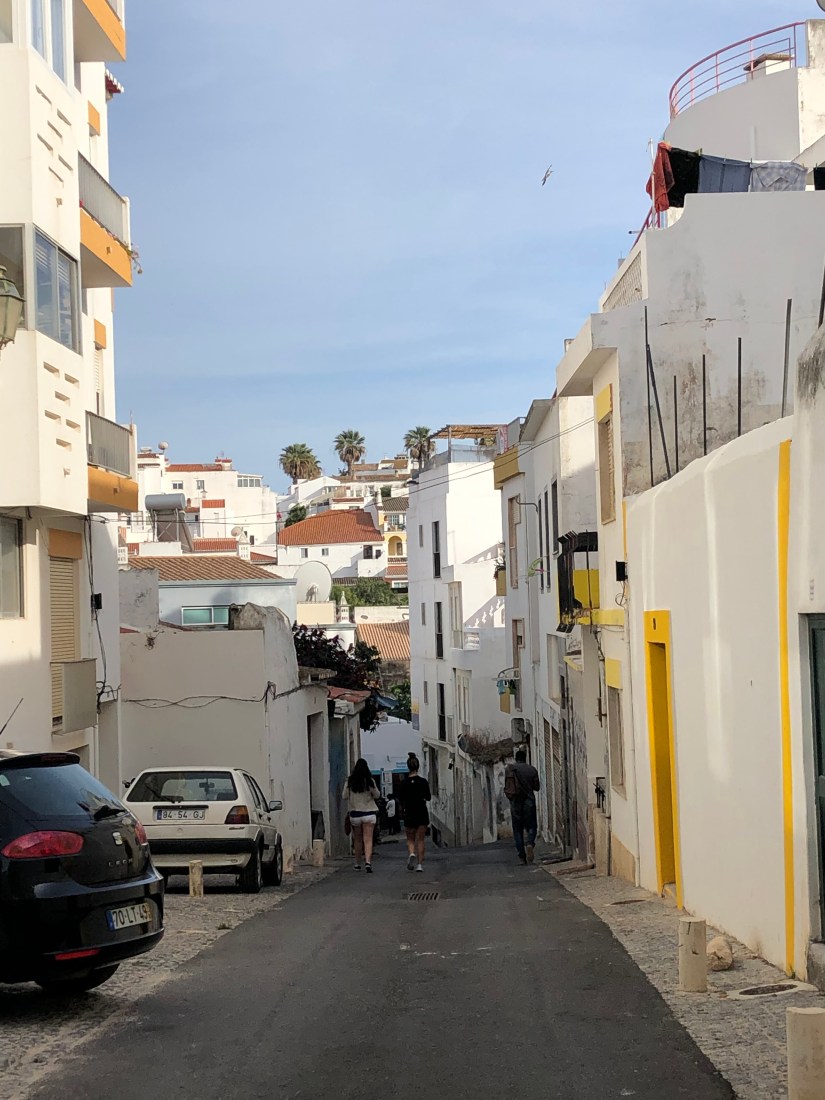 Last night we walked the surprisingly windy and cold old-town pedestrian streets of Lagos, stopping at what felt like a very local wine bar before settling on Casa do Prego for dinner, a delightfully crowded little tapas joint. Dessert — a lime-mint cheesecake mousse in a jar — was so good we ordered another. And then they brought us the usual Portuguese treat, a free after-dinner shot of something in this case a fine tawny port. Rather than do the usual bar-hopping for our traditional nightcaps we stopped in a small shop for a bottle of characteristically inexpensive (six euros) tinto from the Douro region up north, which we took to the room and drained in short order while watching the first of three made-for-TV adaptations of Michael Dibdin’s excellent police procedurals, set in Rome, a city we hope to know better in coming years. (If you’re a fan of Man in a High Castle you’ll enjoy Rufus Sewell’s portrayal of Zen, a far more appealing role than his Obergrüppenfuhrer Smith.)