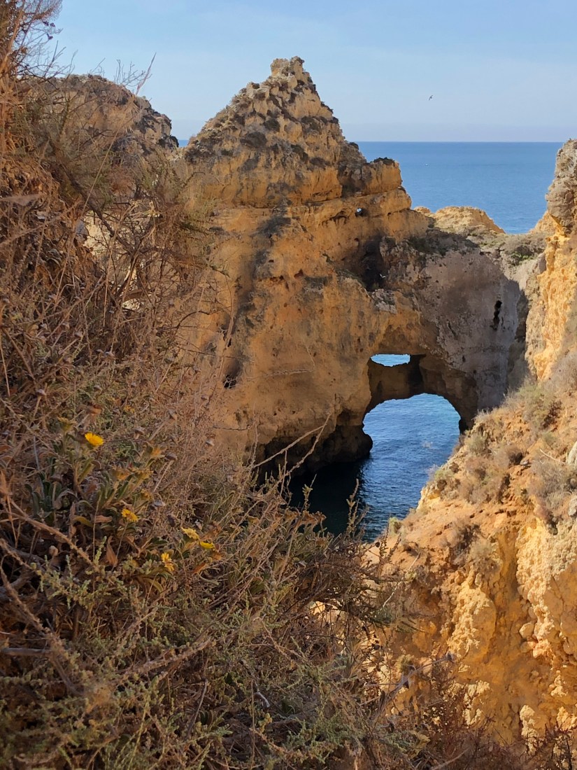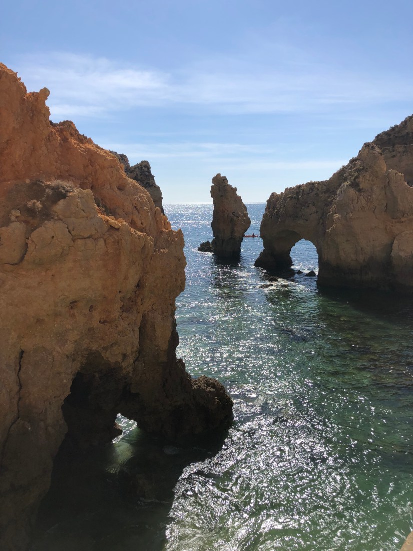 In the morning, before checking out of the Marina Rio hotel in Lagos, we took a cab ride to Ponta da Piedade, one of the Algarve’s scenic highlights. We walked down the hundred + stairs to water’s edge, more or less, to catch the towering golden-yellow rock formations, and the shimmering more green-than-blue water, from the right perspective. Looking down at kayakers and paddle boarders among the cliffs and grottos, we felt envious, but not for long.