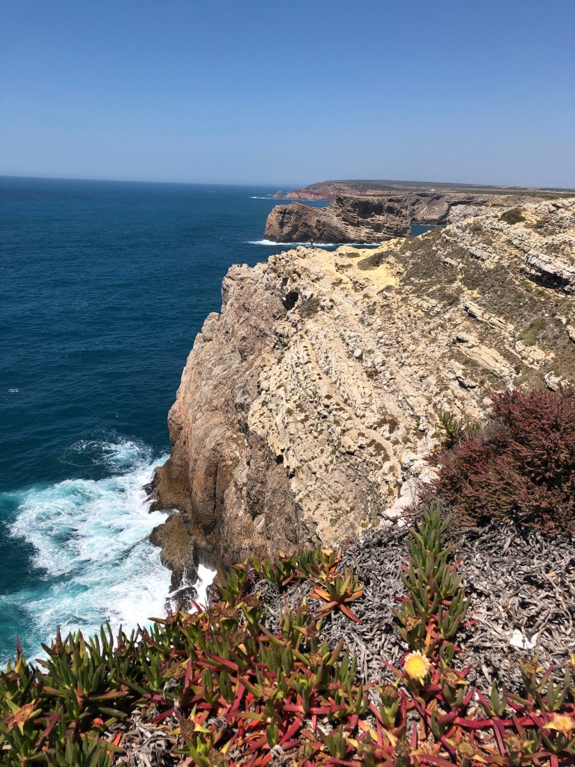 The pies fueled us on a short ride, 8-miles round trip, to the southernmost corner of Europe, the lighthouse at Cabo de São Vicente. 250-foot high wave-pounded cliffs, their tops covered with flowering ice plants, 500-year-old fortresses with gun ports and three-foot-thick walls, and in the distance, all around us, the meeting of the Mediterranean Sea and the Atlantic Ocean.