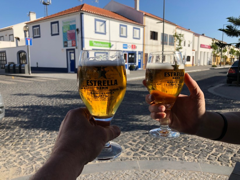 Lunch was in a small cafe right off the main drag of Aljezur—a cod dish for David (which took 25 minutes + to prepare, plenty of time for the headwinds to wake up) and for Ashley, tuna steak so fresh she kept having to spit out the scales (!). After lunch, we climbed and climbed, stopping at a super-local Basque-style cafe (Becha/Bexa) for on-the-spot fizzy water and a bottle of still to go. Inside, the pretty much all-male, salt-of-the-earth clientele were drinking pony bottles of Sagres and engaging in loud and animated conversations. “You are American,” the friendly bartender said to David, tugging on his ear. “I can hear your accent.” So much for speaking Spanish in Portugal.