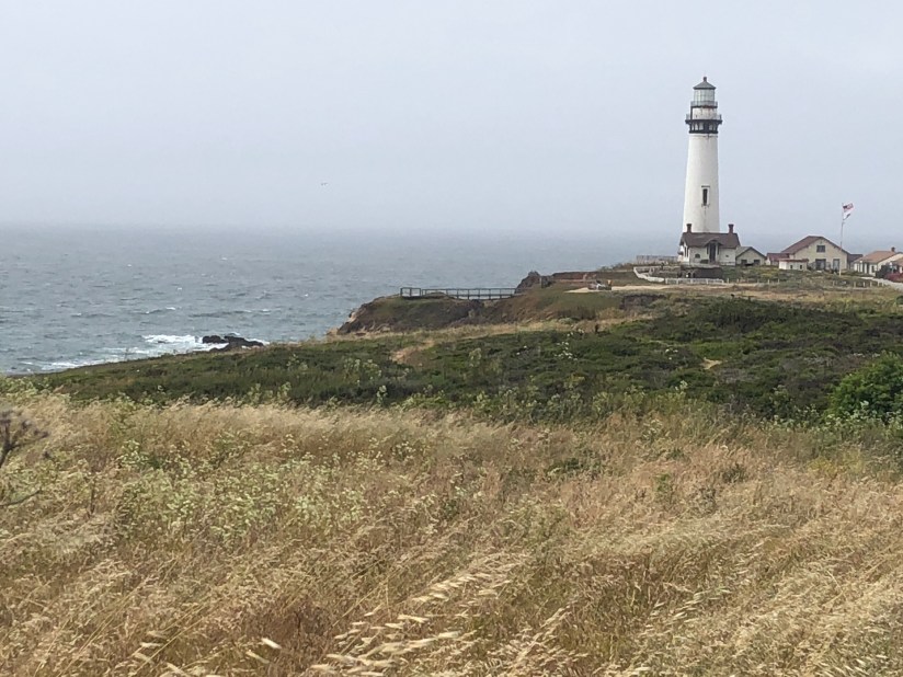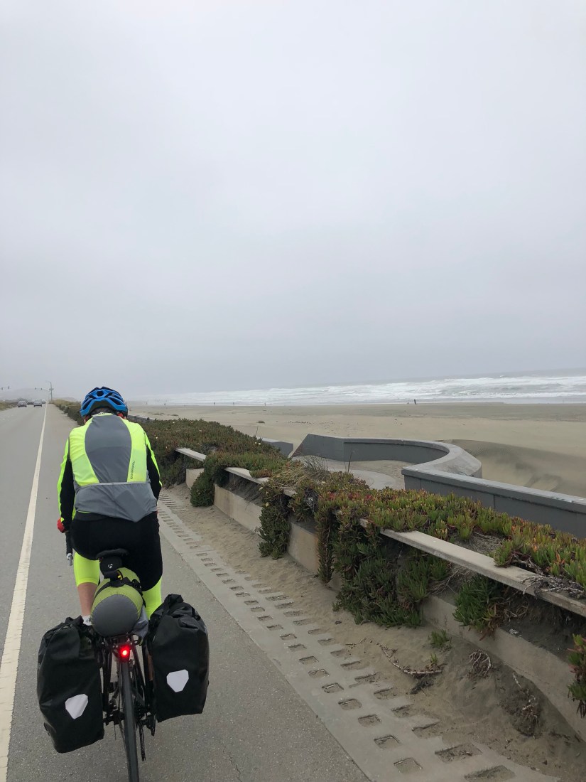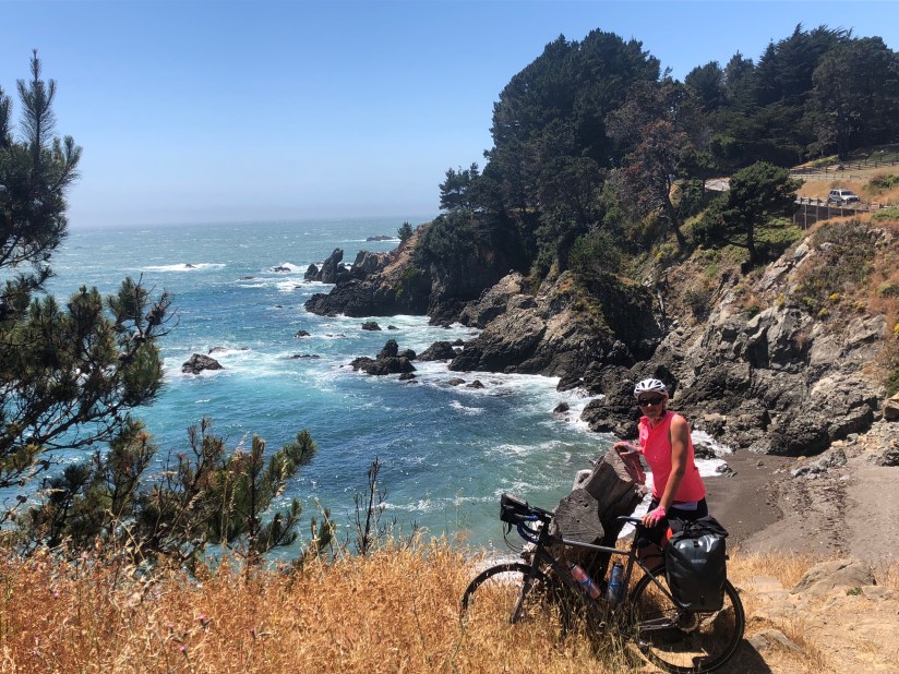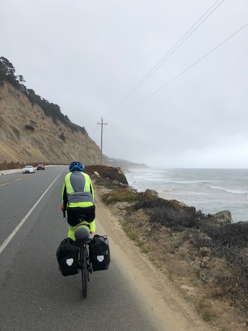Wednesday, Day 20. After downing a couple of buttery, syrupy waffles in the Wharf Master’s Inn breakfast room and pocketing some peanut butter packets for riding snacks, we carted our bikes and gear down the two flights of stairs and took off around 9:30. Rode the mile or so back into town, where we caught Highway 1 againāand we were on that spectacular road all day long.
