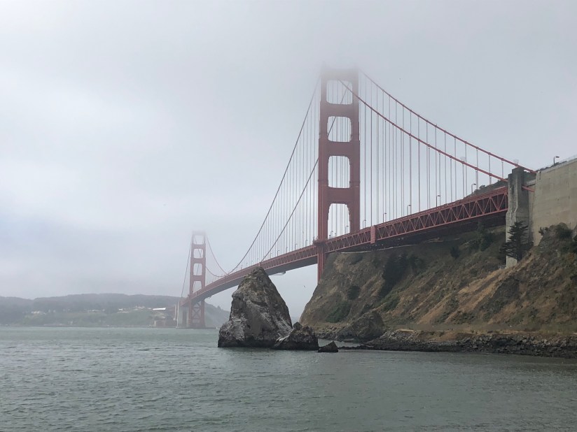 Walked back to our motel, the Oceanside Inn. Econo and basic but clean and decent and run by a very friendly South Asian man and his bad-cop wife, who evicted us from the room at 11am, checkout time, with a loud knocking and a curtly shouted “eleven o’clock!” Fortunately we were already packed up and rolled out into the cool, foggy morning on Ft. Bragg’s Main Street.