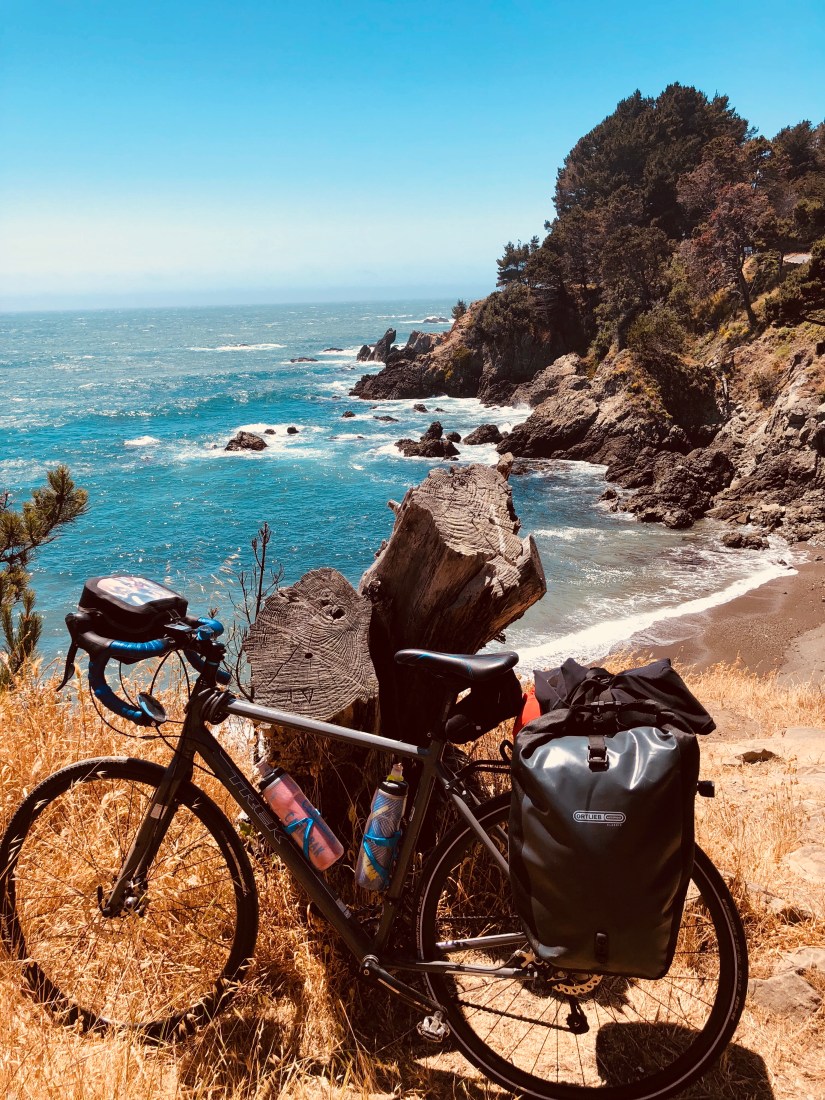 We also met a few other travelers while sitting outside the market. One was a gruff-looking but sweet-natured older motorcyclist wearing tattered Carharts and opining about those who drive too fast on the road: āon any California rode you have to expect to come across bicyclists,ā he said, and he was clearly mystified by those too impatient or too reckless to slow down and enjoy this beautiful place.