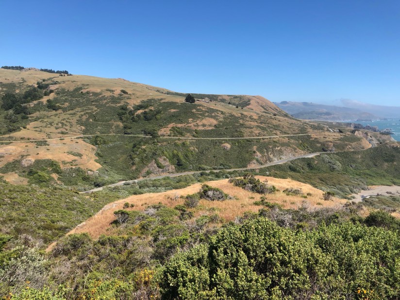 It was another beautiful day, blue skies forever, the Pacific fog bank keeping well offshore, a perfect temperature. It was windy, though, and the wind picked up as the day went on. A tailwind blew us along, and as the road twisted a headwind more than a few times all but stopped us in our tracks (always, of course, while climbing), and occasionally a sidewind rocked us and our bikes back and forth on the road.