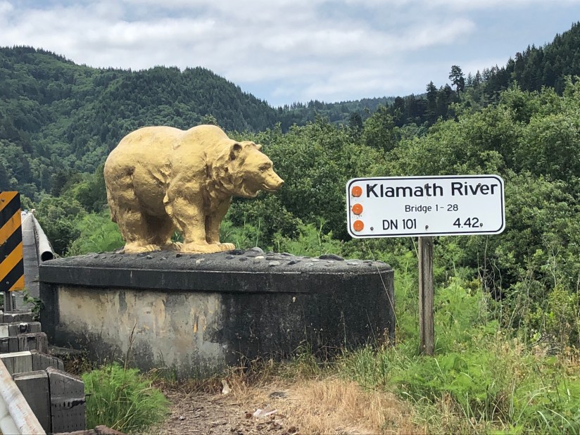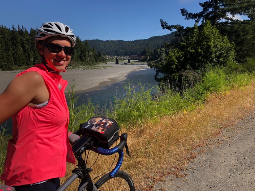 The Leggett climb is notorious among Pacific coast bike tourists, winding up and out of the south fork of the Eel River and over the southern end of the King Range, of Lost Coast fame. We spent at least two days dreading it—which turned out to be a mistake. Yes, it’s a long climb, and at some point during the triumphal descent you discover that there’s yet another long and seemingly steeper climb. Yes, there’s no shoulder and traffic can be heavy. But it’s a beautiful cycling road, well-graded, with serpentine curves that are exciting going up and perfect going down. The forest wall of redwoods offers little vista but some shade, welcome when it’s hot—and this was the hottest, sunniest, stickiest day we’ve had.