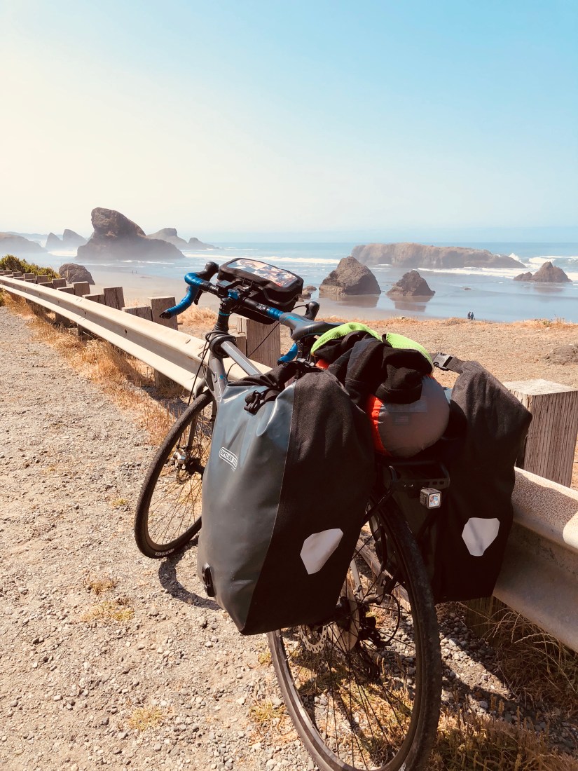Four miles outside of Fort Bragg, having said goodbye to Kristof, we turned off Highway 1, not sorry to be done with its relentless short climbs for the day. We joined a mostly level and somewhat gravelly bike path that took us right along the beach in perfect early evening light. Starving, and racing to get into town before the brewpub closed, we were hauling tail—though we did stop to give a desperate stranded fellow cyclist a patch kit.