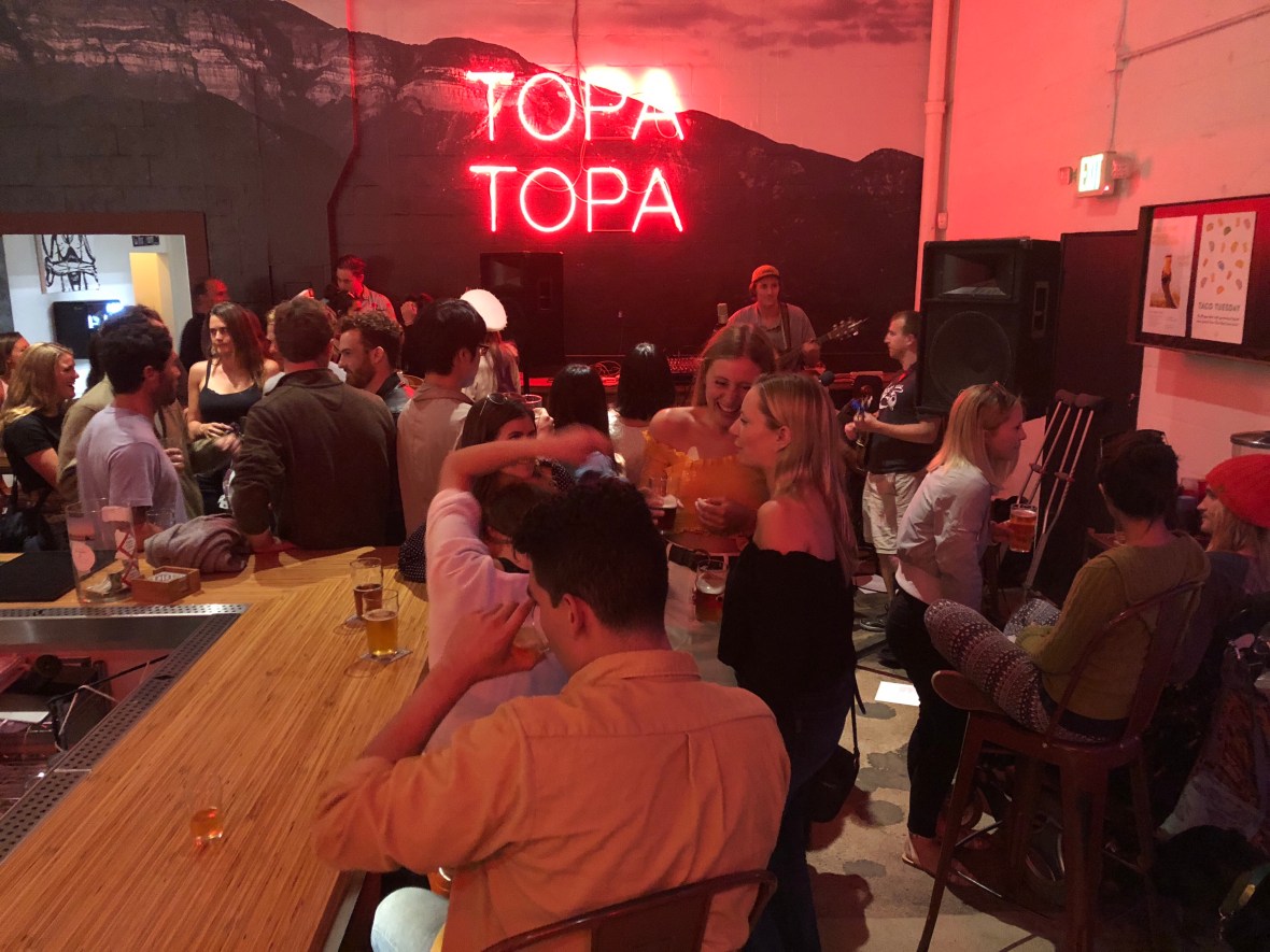 It was a longer walk, but it helped work off the lamb burger. Another warehouse-style space, another trivia night, but good IPAs and a comfortable atmosphere. Any other night we would have lingered, but we greedily wanted to collect one or two more, and since we were limiting ourselves to tastes at each one, that seemed doable. We Lyfted the mile or so to Rough Draft: the writing-teachers in us were taken with the name, but it was a depressing spot and we didn’t linger. Unexceptional in every way. Another short Lyft ride brought us to 32 North, a vast industrial space which was by 9 pm basically empty: us, a distracted barkeep, and one other quiet dude. Another good saison, less memorable than that at Pure Project. With a group, on a bustling weekend, this would be a destination; tonight it felt sleepy, like us.
