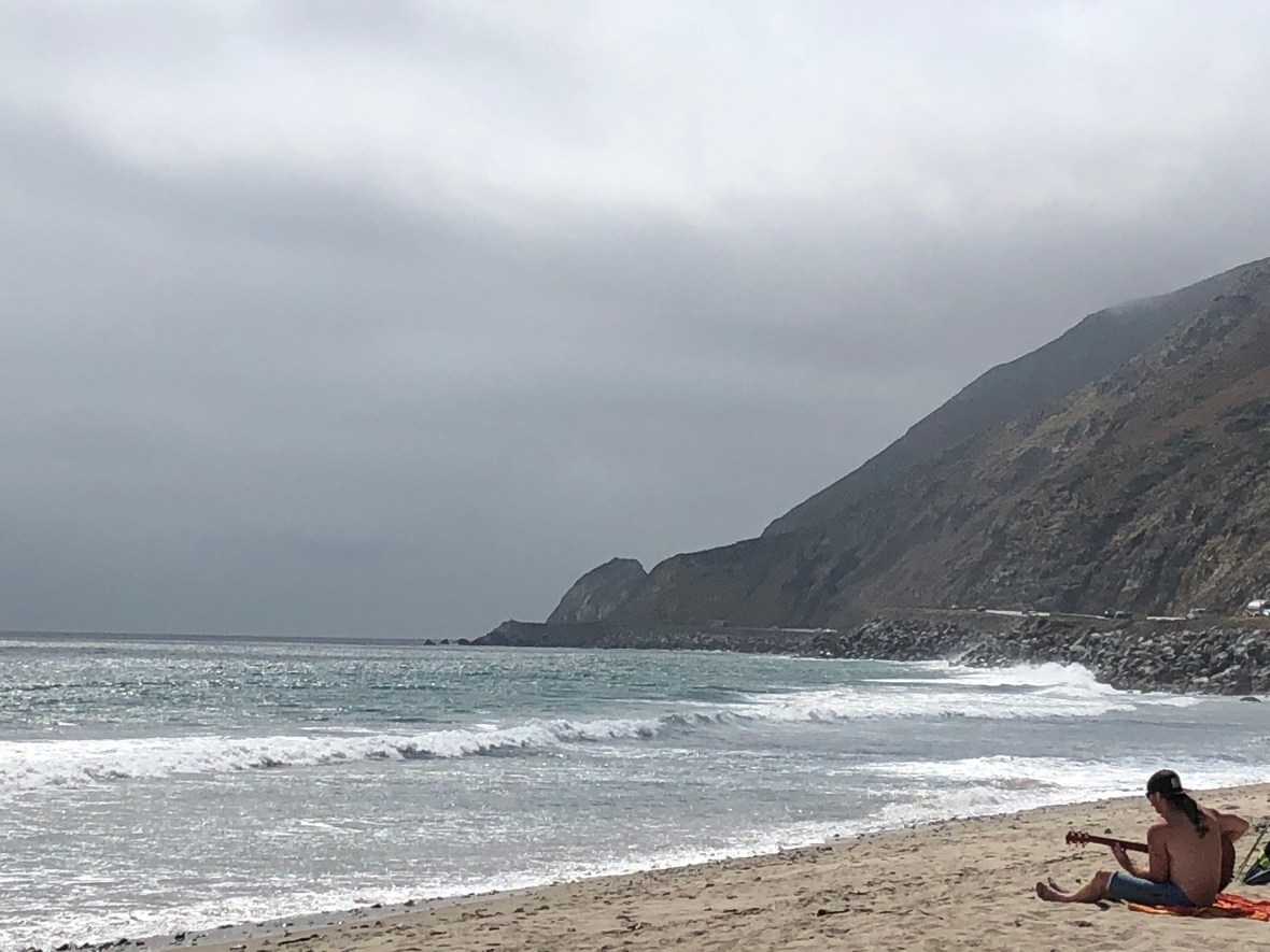 In Encinitas we paused at a bluff-top picnic table to snack and slather on more sunscreen (it’s David who slathers, Ashley content with a few strategic dabs). Down below, as we’ve seen almost continuously for days, frolicked packs of surfers in wetsuits, their vans and RVs parked along the highway, lines of them coming and going along the beach paths.