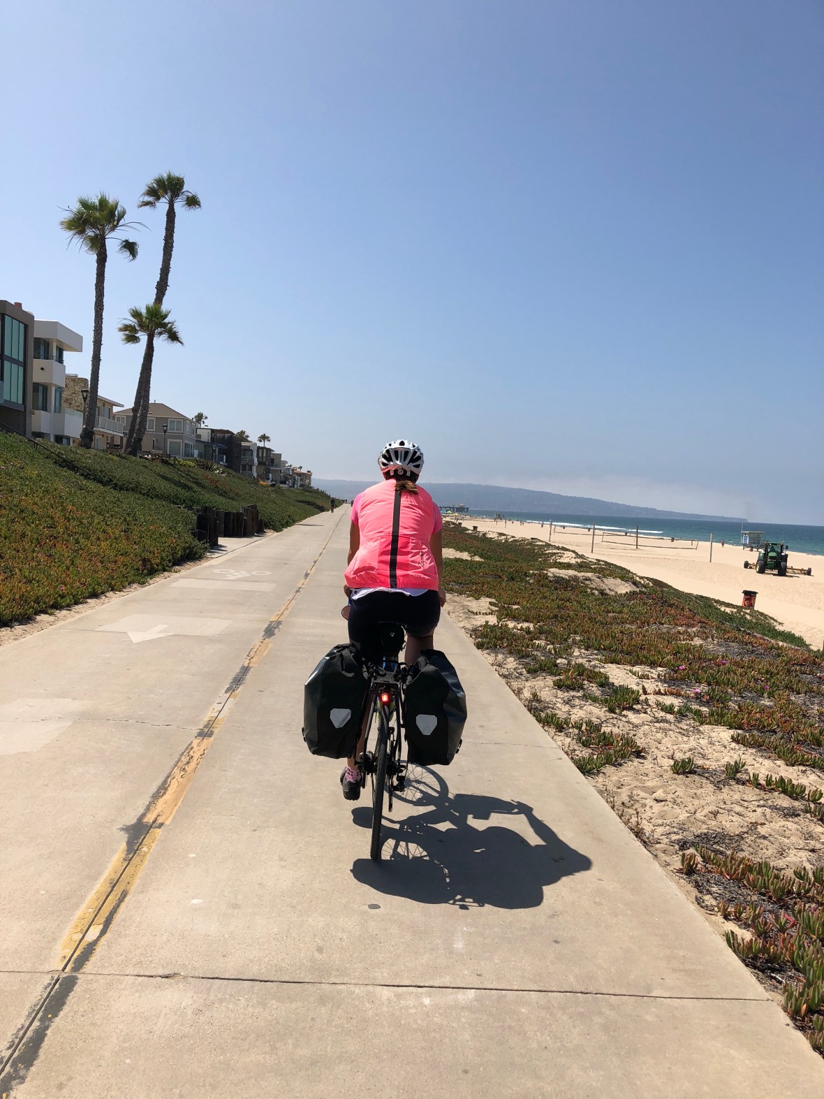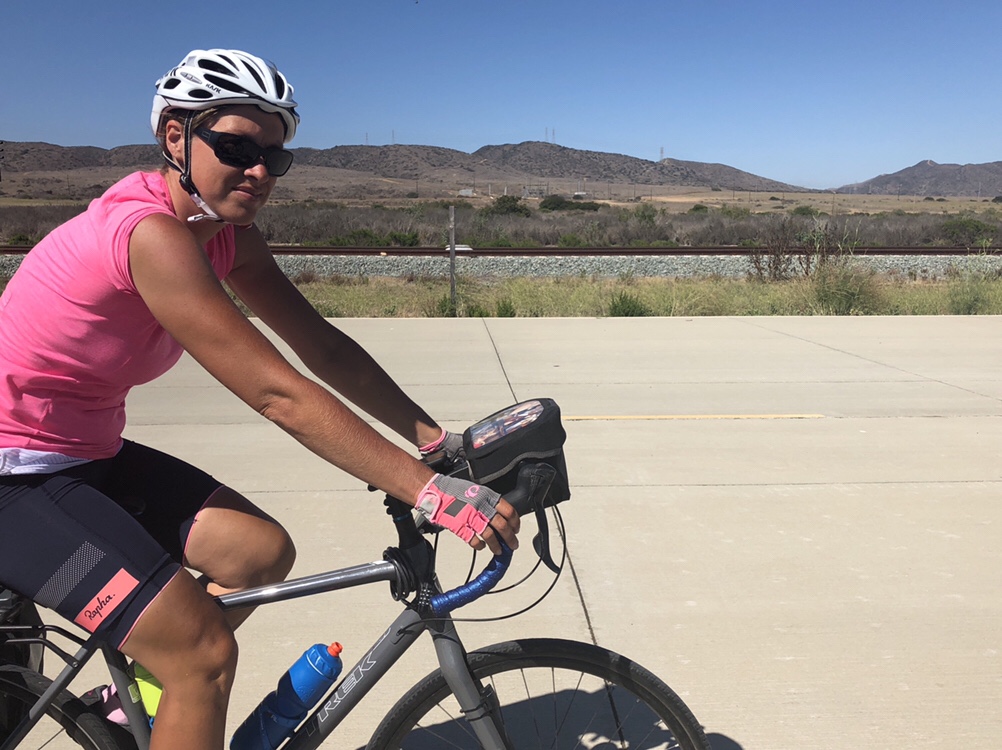 Soon we were a-rollin’ south again, through coastal communities like Carlsbad and Encinitas (the latter especially re-visitable), up and down little hills, over causeways, past harbors and surfing beaches, mostly on wide shoulders and the occasional stretch of bike path. Packs of recreational riders swarmed past us, and posted bike route signs proliferated. It was warm, maybe one of the warmest days of the whole tour, but whenever our generally south-by-southeast heading veered one way or the other, we welcomed the steady cool Pacific breeze.