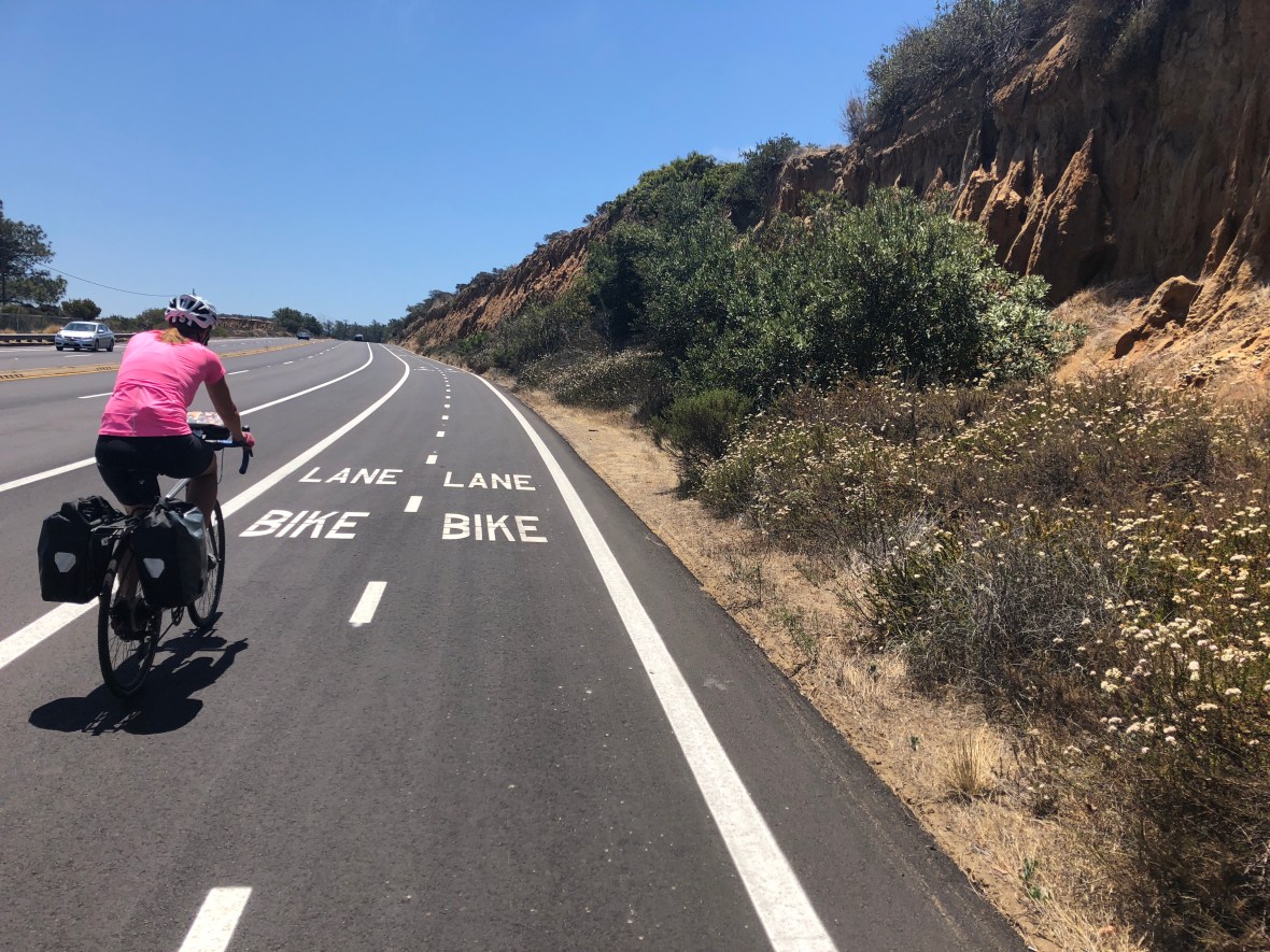 Climbing into Torrey Pines Preserve was the first and only time the shoulder was divided into two bike lanes, the polar opposite of Laguna Beach. It was also the only significant climb today, a few hundred feet. Far cry from the thousand-foot climbs of yore!