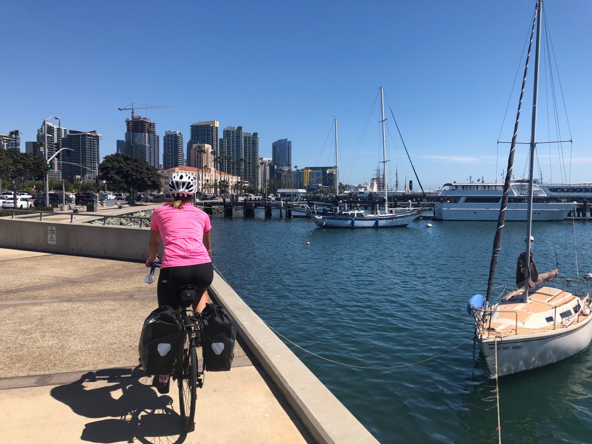 Some busy but well-shouldered urban riding brought us to San Diego harbor, past the airport and along a park-like shoreline to downtown, past the HMS Surprise, a precise replica of an 18th-century 24-gun British warship used to film Patrick O’Brien’s Master and Commander, and a few short blocks up to our hotel.