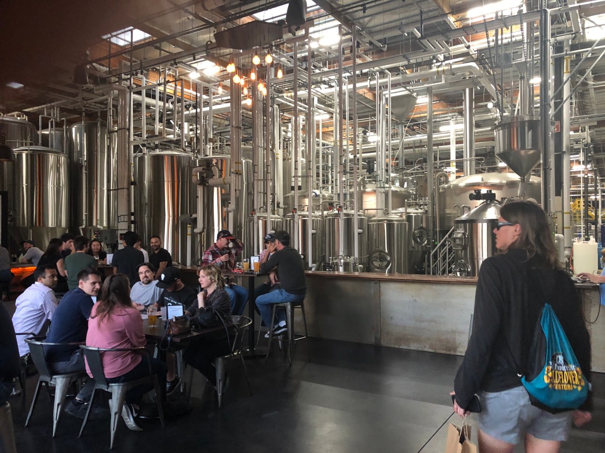 At Ballast Point we had dinner, a little early but we’d had no real lunch, so: calamari, fish tacos, and a lamb burger. All excellent, and we admired the rows upon rows of house brew but sampled only two. From there, a half-mile walk to two smaller spots, side by side: Pure Project (tiny, trendy, packed, with a first-rate saison and a proclivity for triple IPAs, which we always skip); and Amplified, decent but not spectacular, with less range and way fewer patrons. At this point we were shadowing the San Diego beer tour bus, which charges a piratical $75 a pop for a measly three brewhouses. Lyft was cheaper.