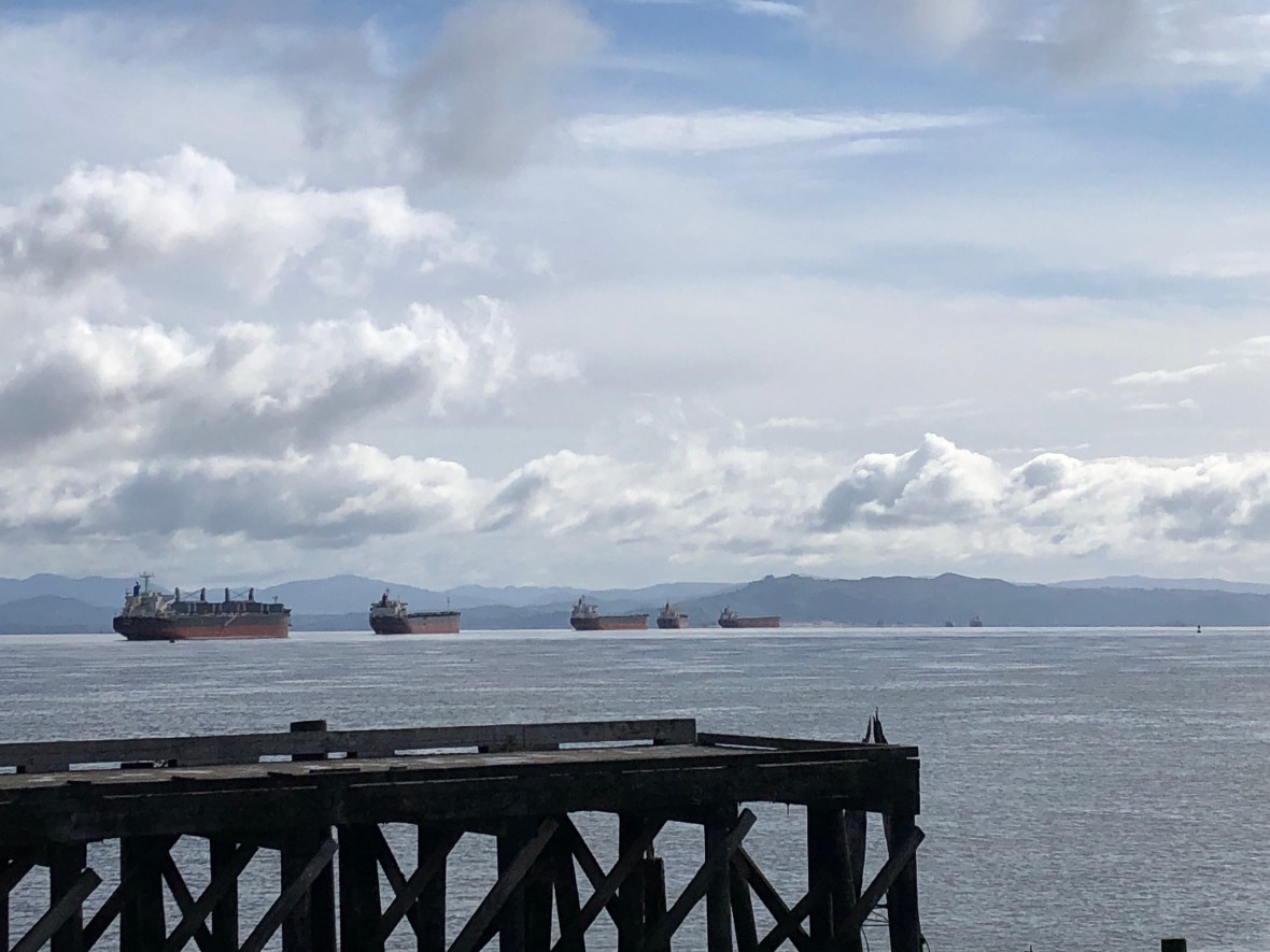 Freighters lined up on the Columbia River at Astoria, headed for Portland. “Gasoline goin’ up, wheat comin’ down.” (Woody Guthrie, “Talkin’ Columbia Blues”)