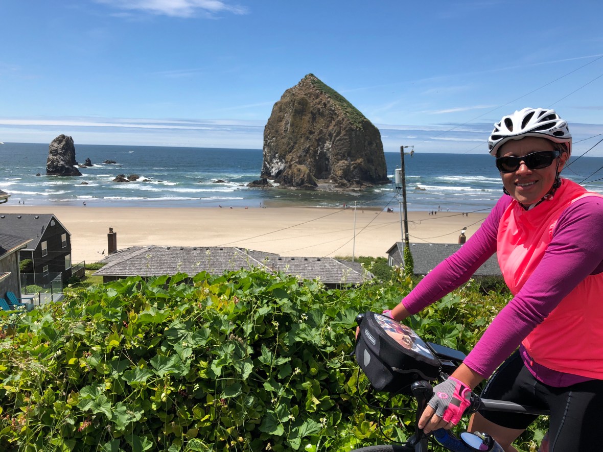 Seaside featured a lovely beachside bike path, and just a few miles south was Cannon Beach, where we lunched at a brewpub (sans brew). It felt touristy and cute, in a nice way, the kind of little New Englandy saltbox village where we might want to escape for a week some hot Reno summer. Just outside of town, we saw our first sea stacks.