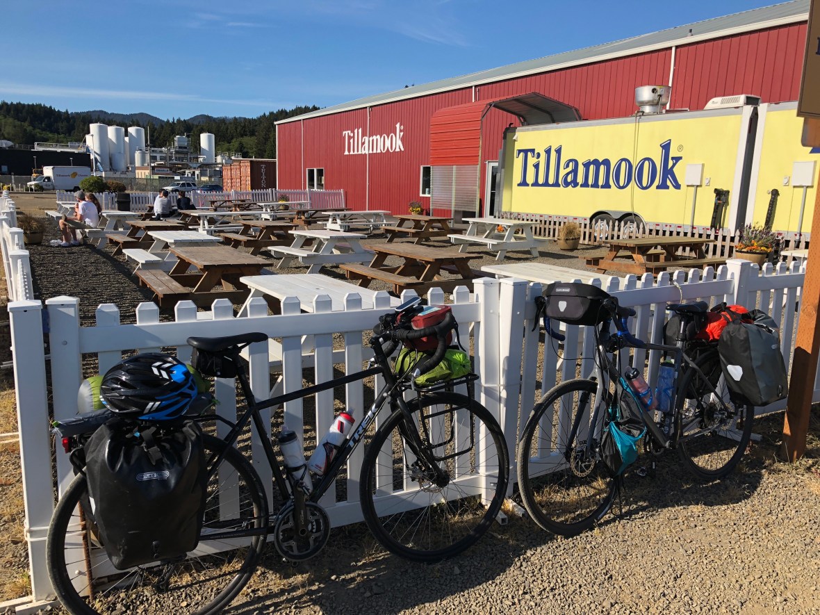 Finally, handlebar bag packed full of local fruit, we arrived at Tillamook, and just a mile before our motel, stopped at the eponymous dairy for ice cream, first of the tour. Even the pervasive north Tillamoooook smell of silage — fermented fodder that smells a lot like cowshit, spread on the fields–didn’t dampen our enthusiasm for a meal and a few pints at Pelican Brewing Company.