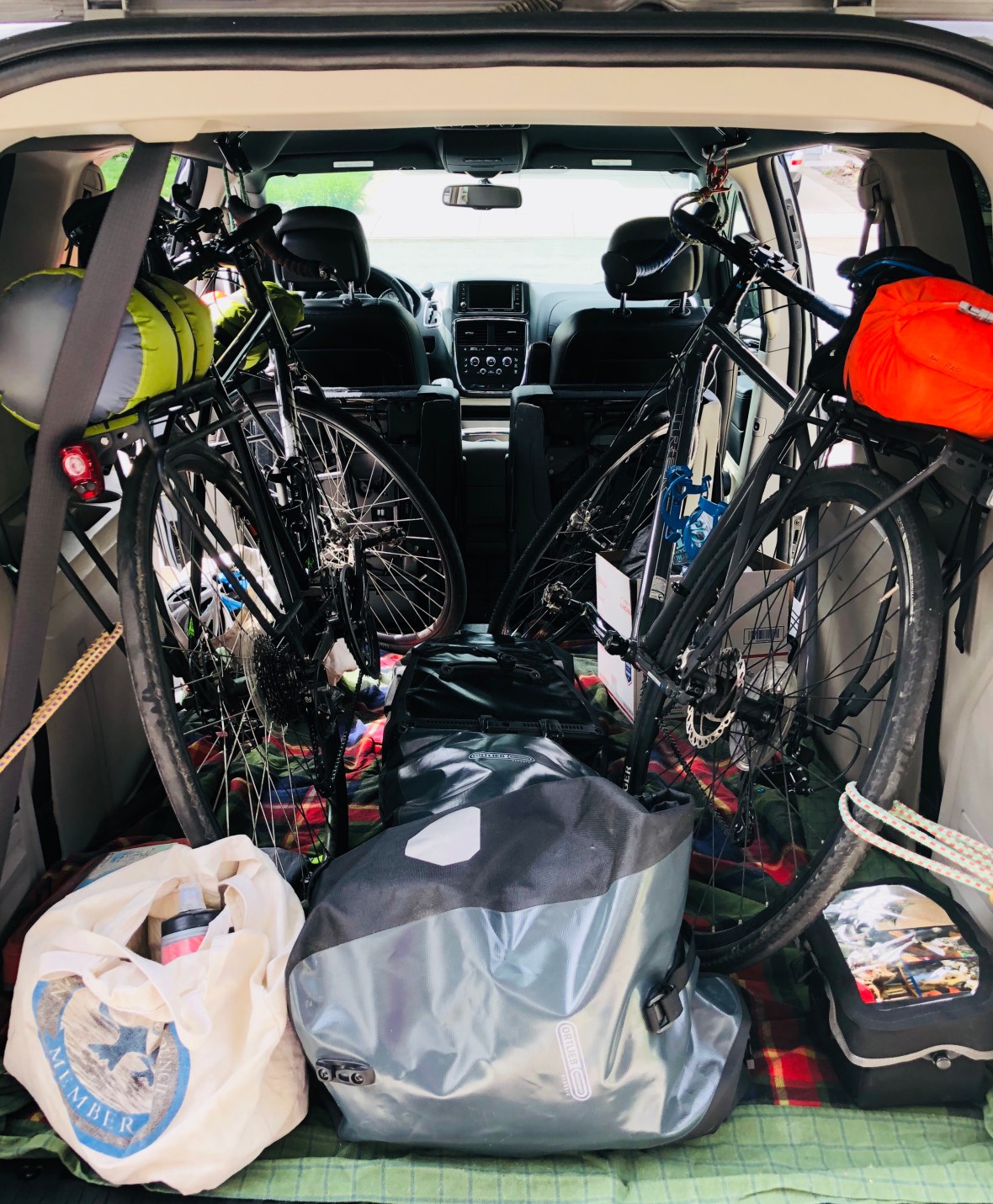 — well, almost all of it (not the cats’ bed or blanket or the basket or roll of yarn)Â will fit into four panniers and a pair of handlebar bars. Stay tuned for our findings!