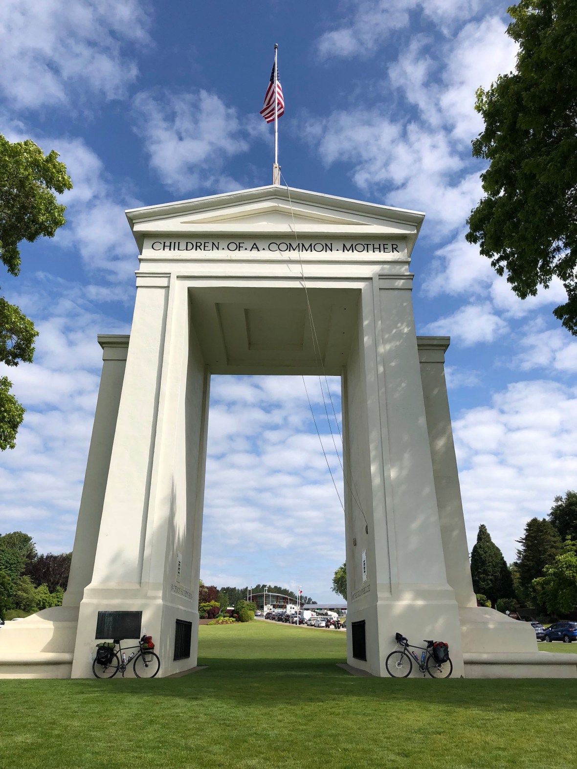 Friday morning our friend and host Joseph (Sign with Your Baby) shuttled us to the Canadian border near Blaine, WA–by way of a delicious breakfast at the Wake-and-Bakery in Glacier. We got to the Peace Arch–a little bit of pastoral beauty sandwiched between two lines of border-crossing traffic–at 10-ish. A lovely passerby snapped the obligatory back-tire-in-Canada pics for us, and we were off.